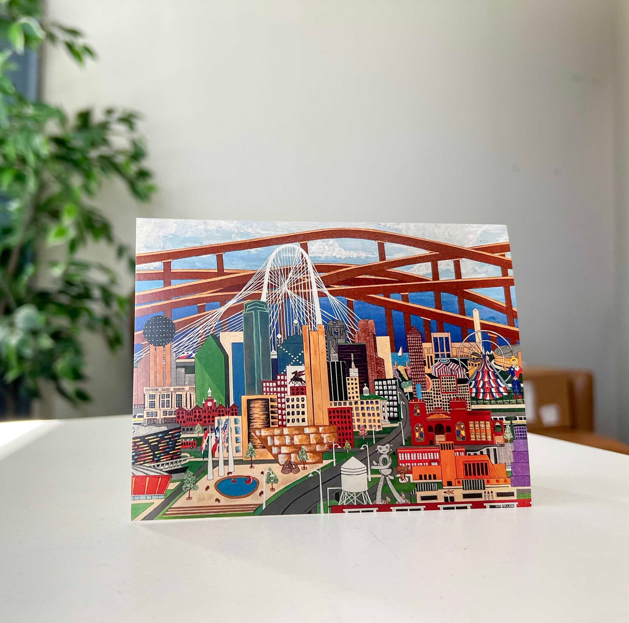 Celebrate Dallas's iconic architecture with this distinctive 10-card set featuring an original painting by Stewpot artist Leon Pollard. The card showcases beloved local landmarks and captures the unique character of Dallas. These 4x5⅓ inch blank cards are perfect for personal correspondence, art appreciation, or thoughtful gifts. Includes envelopes. Ideal for those who cherish Dallas' architectural heritage, want to support local artists, and want to give to a worthy cause.